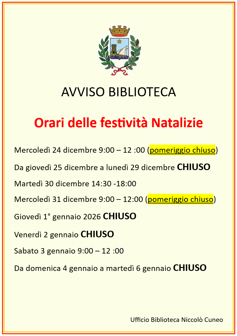 AVVISO AGLI UTENTI: Orari delle festività natalizie della Civica Biblioteca “N. Cuneo”: